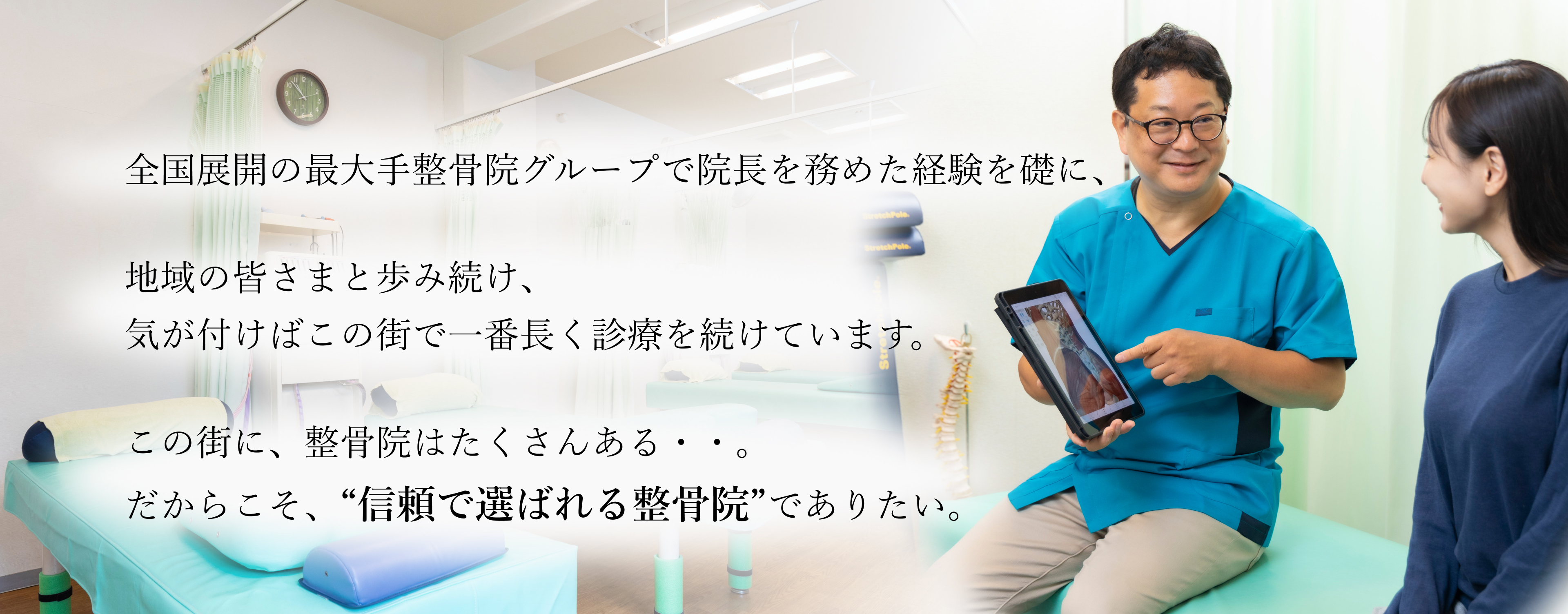 整骨院業界最大手のグループで院長を務めた経験を活かし、個人院として、施術から運営まで全ての責任を持って取り組んでいます。