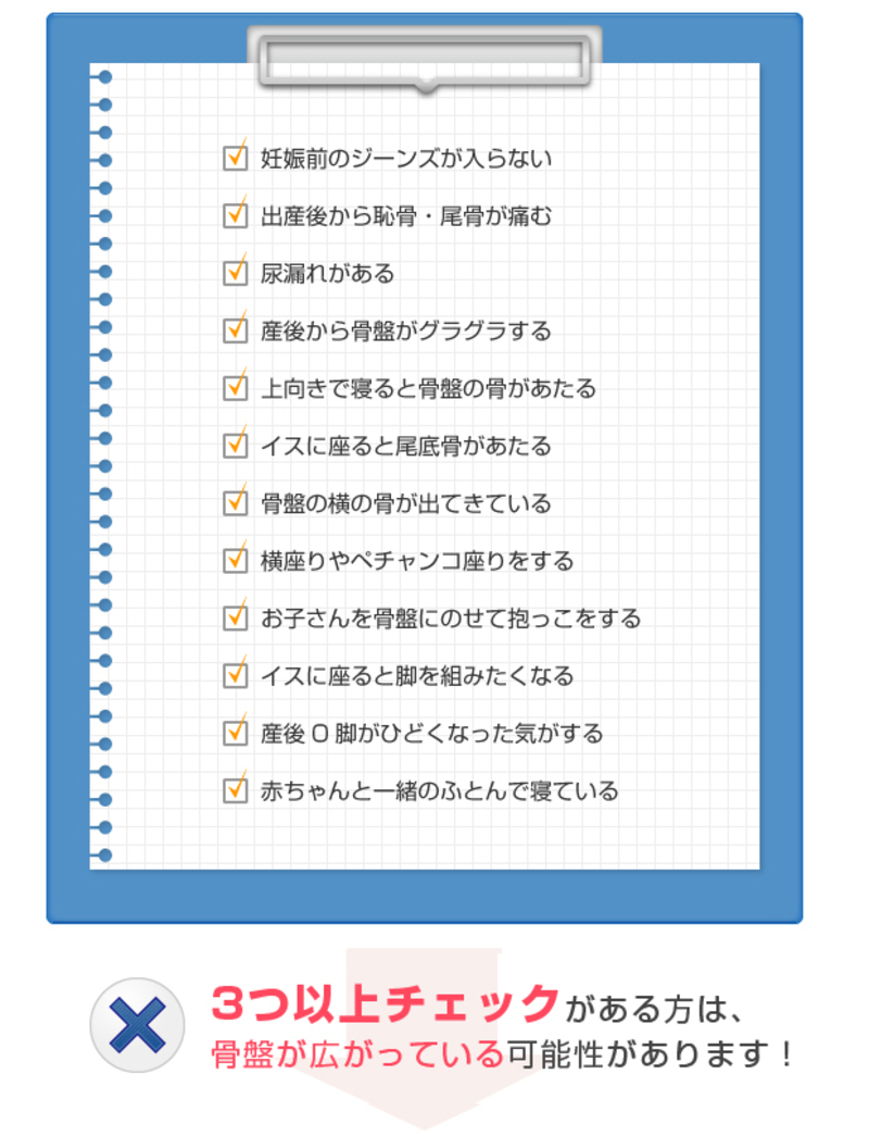 出産直後は、骨盤はまだ開いたままの状態です。そして開いた骨盤は、時間をかけて元の形状へと収縮するしくみになっています。しかし、元々骨盤にゆがみがあった方や、妊娠期に骨盤がゆがんでしまった方は、骨盤が上手に元の形へ戻ることができず、ゆがんだまま固まってしまうことがあるのです。
